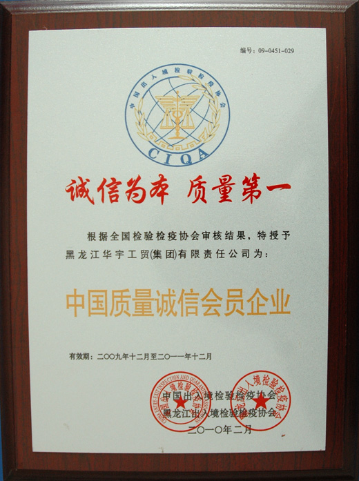 這次活動突出多年以來符合“產(chǎn)品質(zhì)量好、品牌信譽(yù)好、經(jīng)營狀況好、社會形象好、團(tuán)結(jié)和諧好”的條件,嚴(yán)格推薦、審核程序,全程公開透明,推薦的132家會員企業(yè)經(jīng)過公示,最終確定131家為全國檢驗(yàn)檢疫協(xié)會“質(zhì)量誠信會員企業(yè)”,其中黑龍江省有三家企業(yè)榜上有名,黑龍江華宇工貿(mào)(集團(tuán))有限責(zé)任公司獲此殊榮。